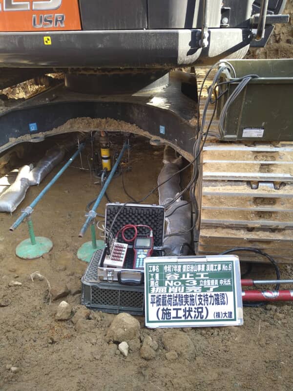 床付け面の支持力測定を4時間かけて地盤の沈下量を測定しています。